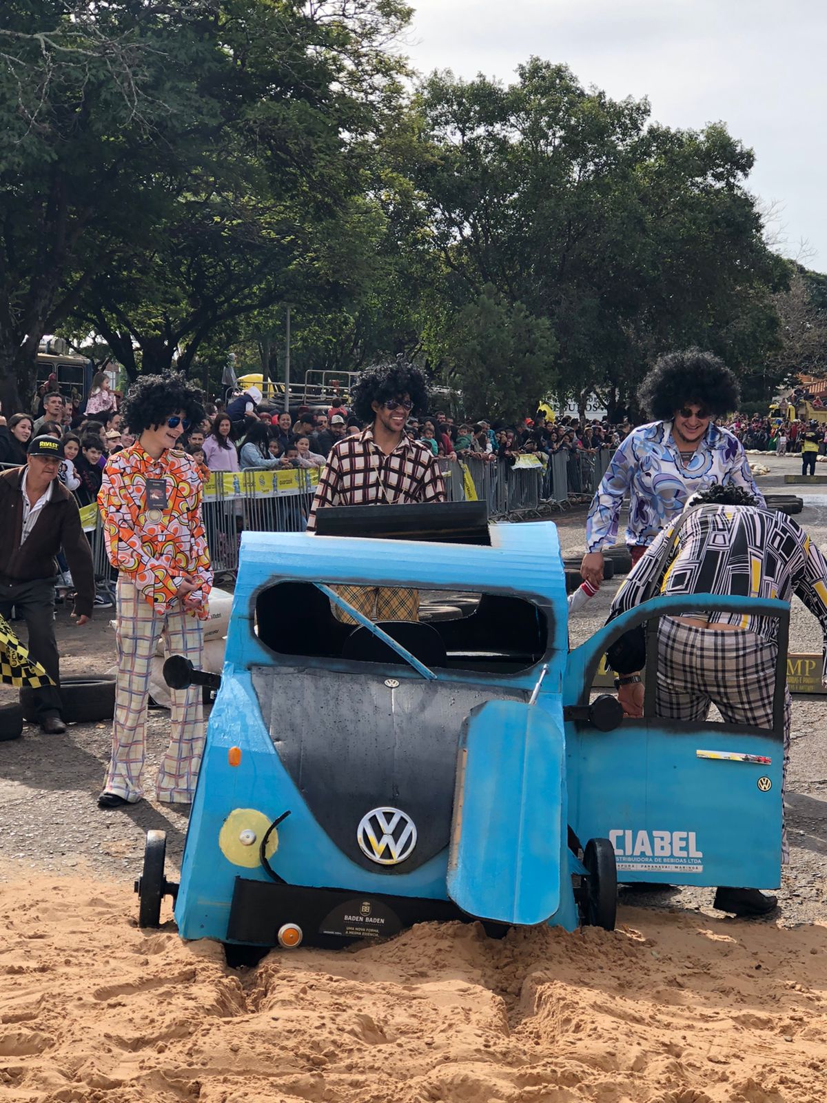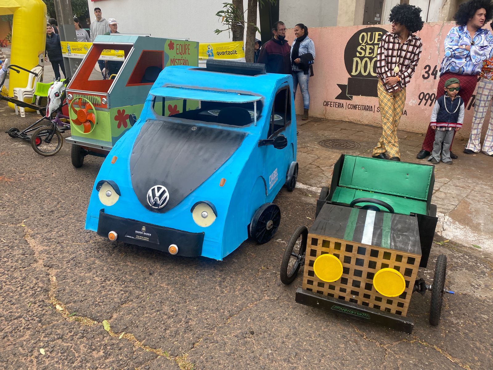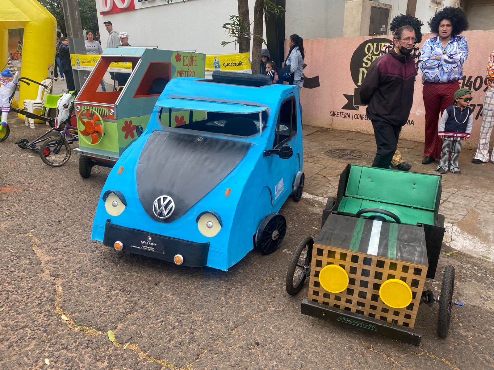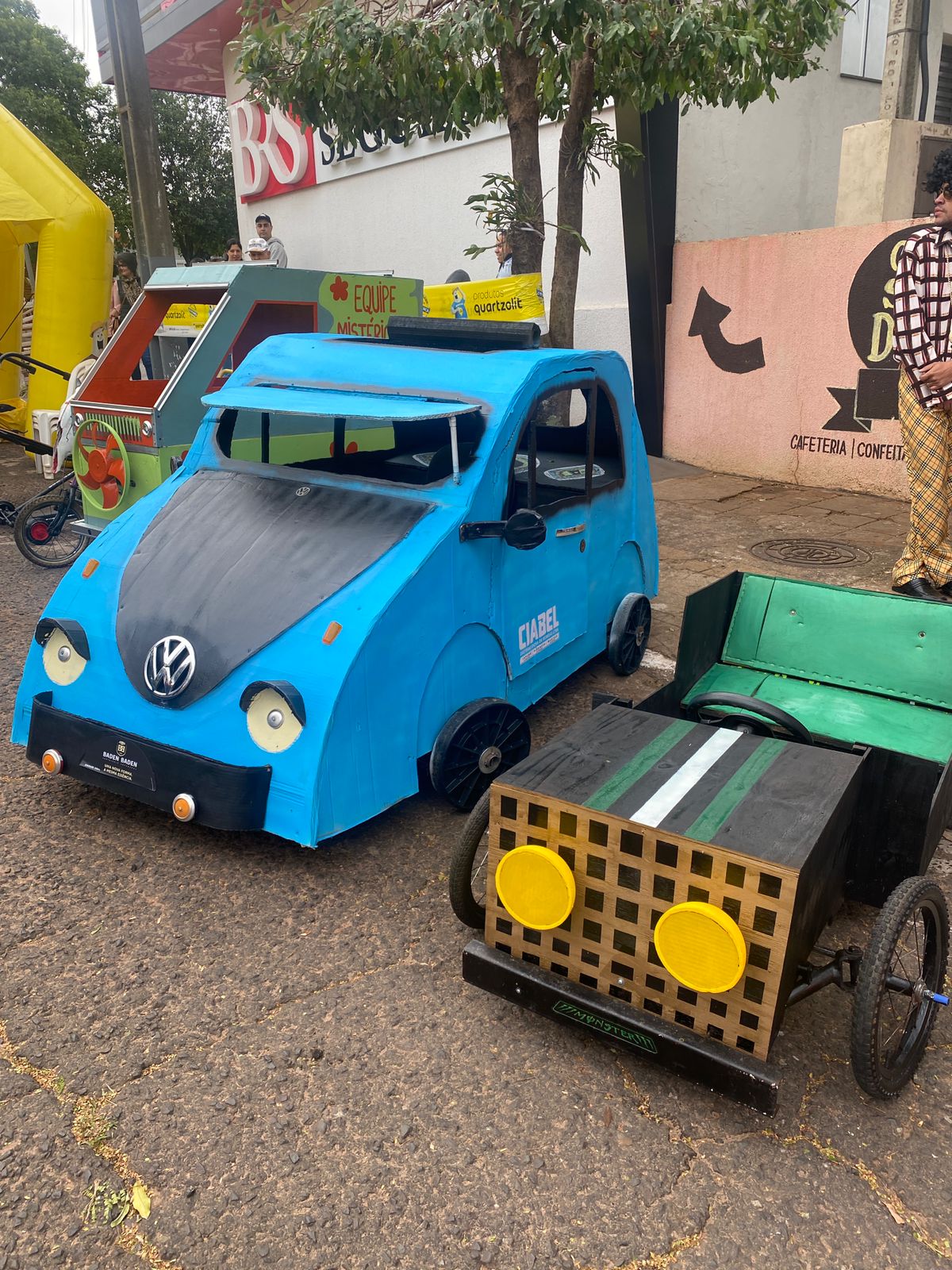 Outro carro que chamou bastante atenção de quem passava por ali foi o fusquinha azul, da equipe Os Herbes. Inspirados no filme, eles fizeram a estrutura toda de madeira e o acabamento inteiro em papelão. O volante foi soldado por um dos participantes que utilizou correntes para dar vida ao carro.