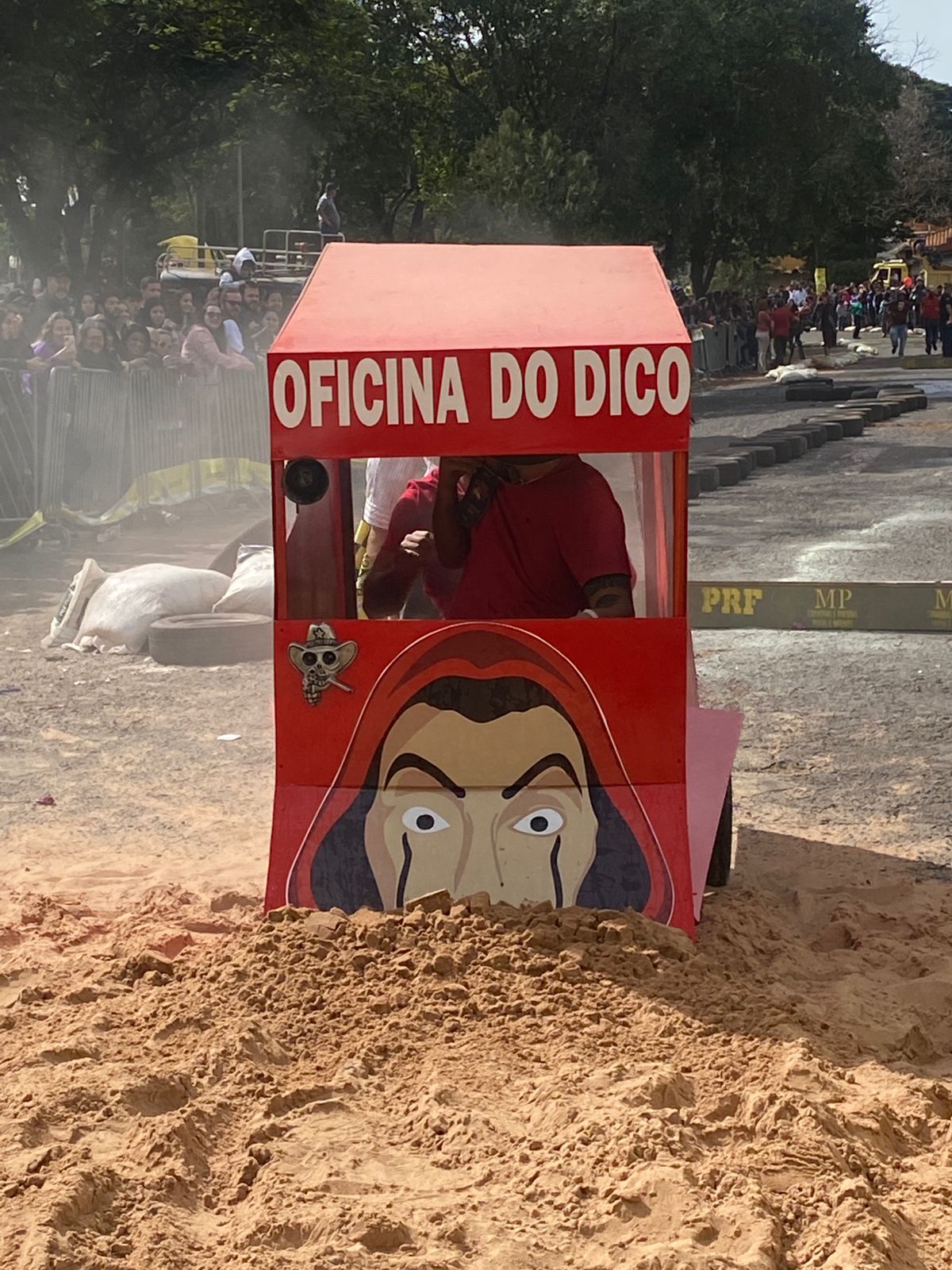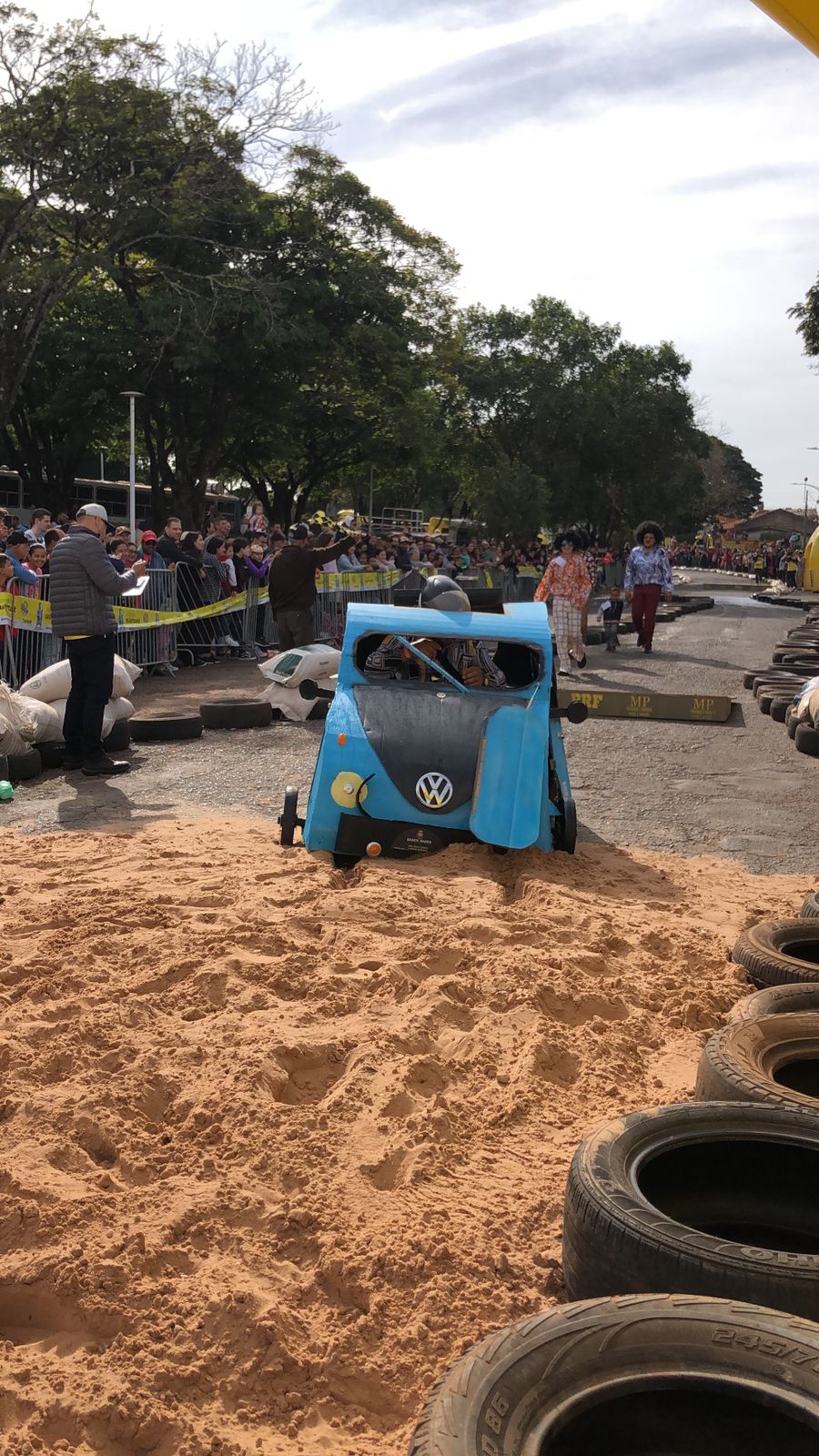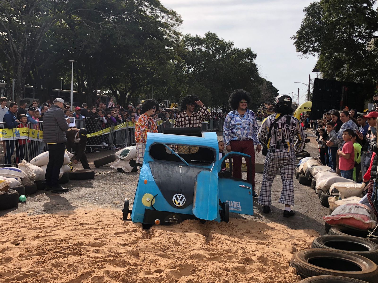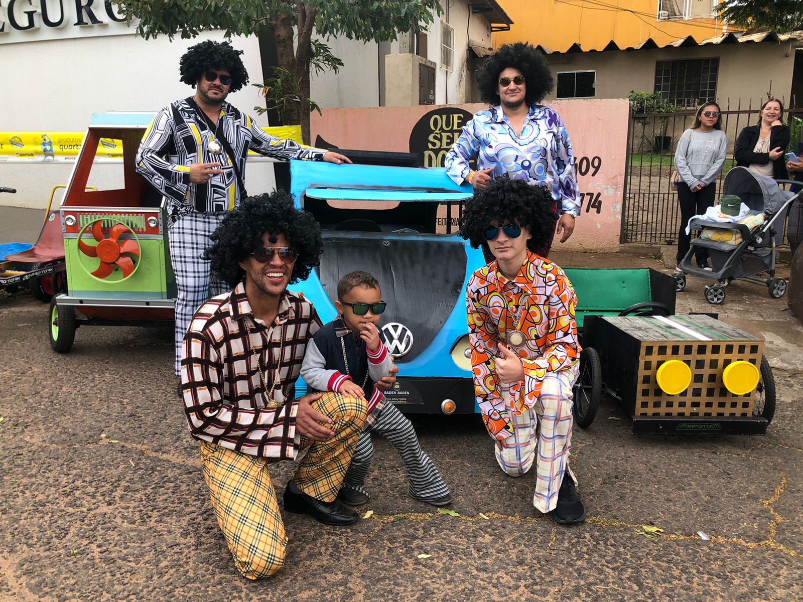 Outro carro que chamou bastante atenção de quem passava por ali foi o fusquinha azul, da equipe Os Herbes. Inspirados no filme, eles fizeram a estrutura toda de madeira e o acabamento inteiro em papelão. O volante foi soldado por um dos participantes que utilizou correntes para dar vida ao carro.