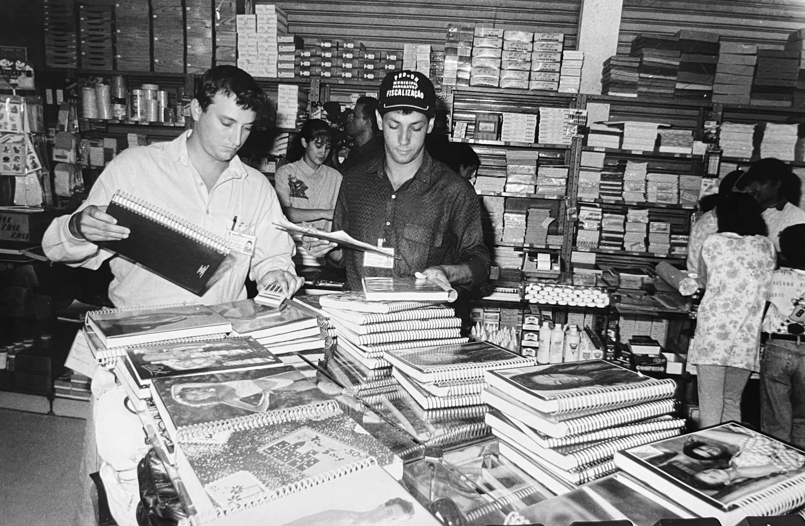 Material escolar. A foto é de 10 de fevereiro de 1995 e mostra Arboleia e Asterio (nesta ordem), em uma livraria muito conhecida na cidade. Era tempo de volta às aulas e os servidores municipais sempre alertavam que a pesquisa funcionava como um norteador, já que não havia (e não há) tabelamento de preços para quaisquer produtos verificados. A pesquisa em questão foi publicada no DN com o título: “Procon divulga lista de preço para o material escolar”.