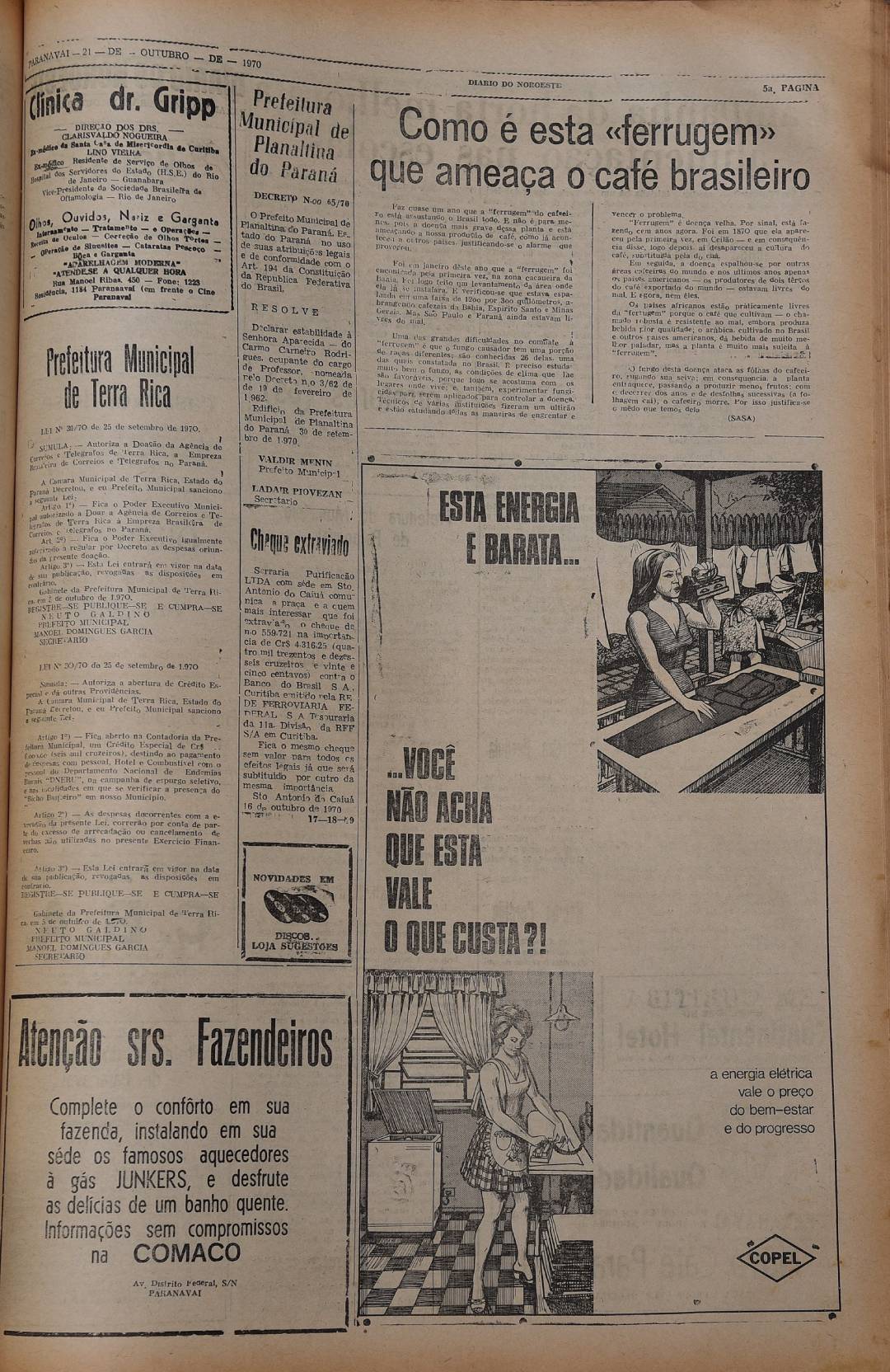 Dentre tantos assuntos de época, um anúncio da Copel chamando a atenção para os benefícios da energia elétrica. Uma frase definia a ideia original: “A energia elétrica vale o preço do bem-estar e do progresso”, no caso específico, um contraponto ao trabalho árduo de passar roupas com ferro à brasa.