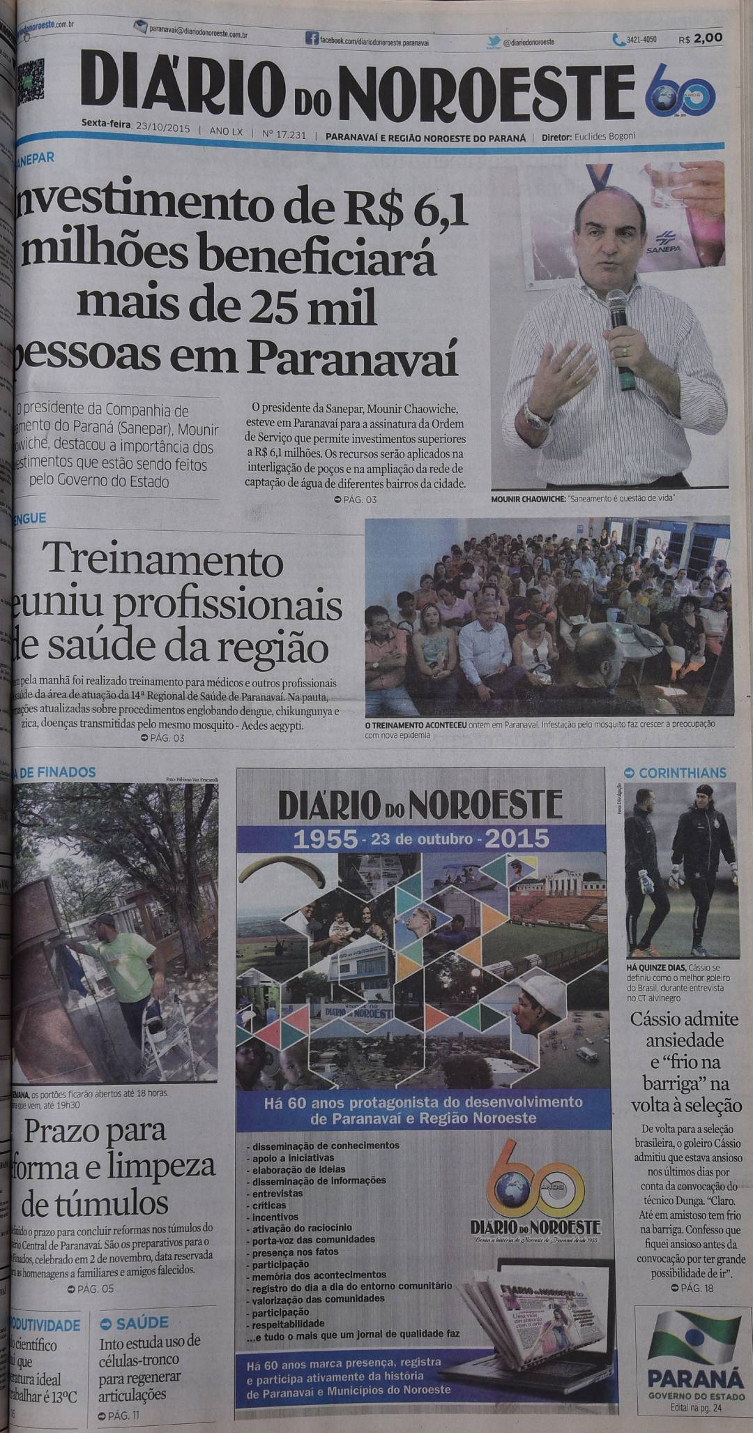 Chegamos a uma edição, digamos, mais contemporânea. O ano é 2015. No dia 23 de outubro, o DN apresentava matéria sobre investimentos que seriam feitos pela Sanepar no fornecimento de água e serviço de esgoto em Paranavaí. A edição também pontuava na capa o aniversário do jornal, que completava 60 anos naquele dia. Para os corintianos, um destaque do esporte: “Cássio admite ansiedade e frio na barriga na volta à seleção”.