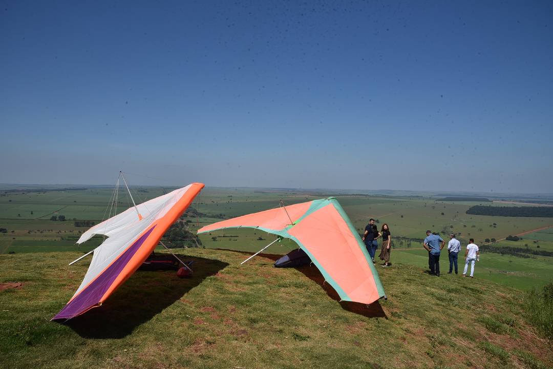 Alguns passos no topo da montanha e o piloto de asa-delta ganha os céus de Terra Rica. É empurrado pelo vento e guiado pela força do próprio corpo. Ele se distancia dos Três Morrinhos e voa na direção do horizonte azul. Desafia a gravidade e vence. Um, dois, três, dez minutos. À medida que o tempo passa, começa a descer até chegar ao solo.