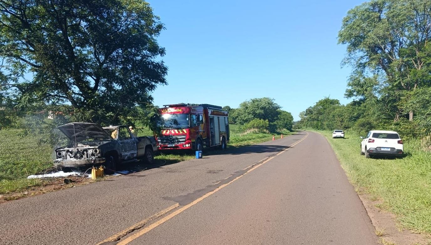 Uma caminhonete ficou destruída após pegar fogo na tarde desta segunda-feira (10). O veículo estava estacionado à margem da PR-492, em Tamboara, quando as chamas começaram. A suspeita é que problemas elétricos tenham dado início ao incêndio.