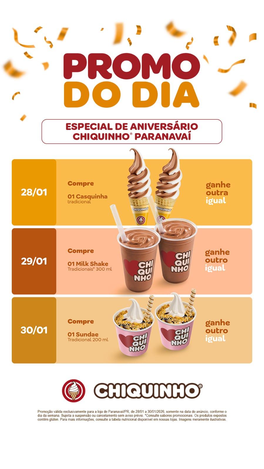 Quem ainda não é cliente pode conhecer a qualidade dos produtos aproveitando a promoção especial de aniversário da franquia. Até esta sexta-feira (30), na compra de um item Chiquinho Sorvetes, o cliente ganha outro de graça. A promoção é válida para os milkshakes e sundaes tradicionais da marca.