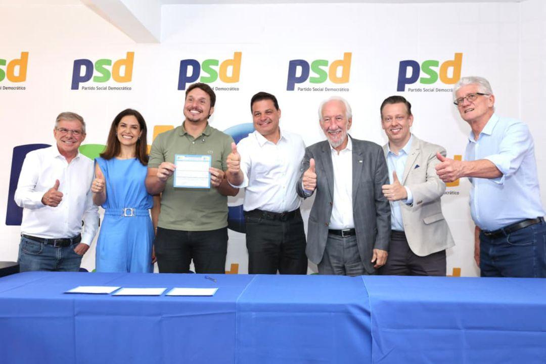 Na foto, acompanhado do presidente da Cohapar, Jorge Lange; secretária executiva do PSD-PR, Sandra; secretário de Infraestrutura e Logística, Sandro Alex; vice-governador Darci Piana; chefe de gabinete do governador, Darlan Scalco; e secretário da Fazenda, Norberto Ortigara.