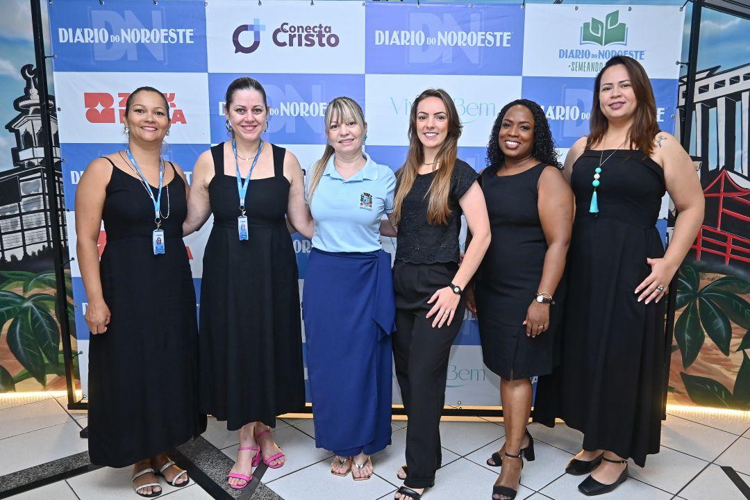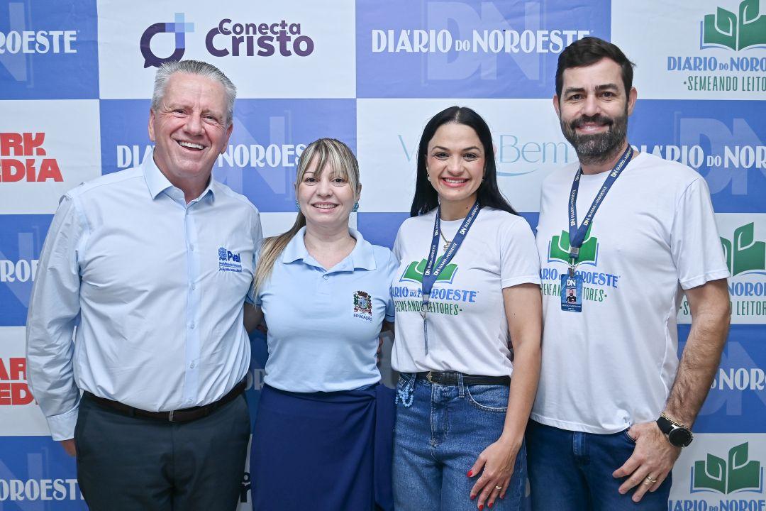 Secretária Wanessa Durante, acompanhada da equipe da Secretaria de Educação, que foi responsável pela parte pedagógica e acompanhou de perto o projeto.Casal de diretores do Diário do Noroeste, Bruna e Sérgio Carvalho, acompanhado do padre Rivaldo Brandão.Prefeito Maurício Gehlen, secretária Wanessa Durante, e Bruna e Sérgio Carvalho.Sérgio Carvalho e o presidente da Câmara Municipal de Vereadores, Carlos Augusto.A aluna Lorena Garcia Nogueira, vencedora do concurso, acompanhada da professora Jheniffer Mariano da Silva, supervisora Ivana Preuss e diretora Letícia Jasper, da escola Professora Maria Schuroff Back, distrito de Graciosa.