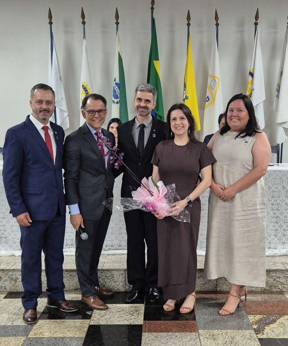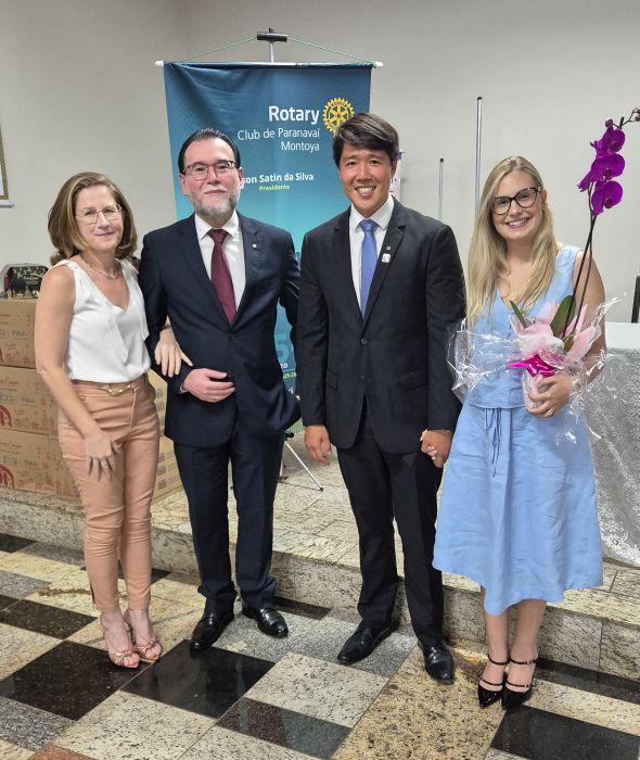 O novo rotariano Gustavo Romera Barbiratto, apadrinhado por Edgar Penha, aparece ao lado de sua esposa Jhessica Zezak, do presidente do Rotary Club de Paranavaí-Montoya, Edson Satin, e da governadora assistente Caroline Vendramin.
