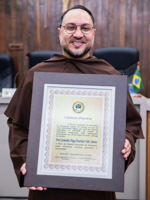 O Frei Tiago Evaristo do Vale Santos, O.Carm., pároco do Santuário Nossa Senhora do Carmo e Paróquia São Sebastião, recebeu o título de Cidadão Honorário de Paranavaí ao em reconhecimento ao seu serviço e dedicação à nossa comunidade, na última quarta-feira. A honraria foi proposta pela vereadora professora Cida Gonçalves.