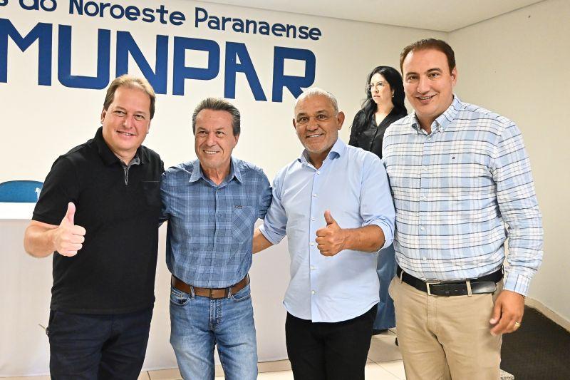 Na imagem, Emerson Bratti; o secretário da Agricultura do Paraná, Márcio Nunes; o prefeito de Nova Aliança do Ivaí, Ulisses de Souza “Licinho”; e Rodrigo Pezão, em um momento de diálogo e articulação, reforçando a integração e o fortalecimento do municipalismo na região.