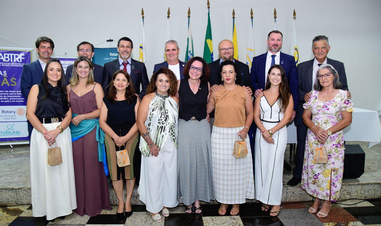 Na foto, acompanhados de suas esposas, os novos rotarianos Leandro Gagliard, Wagner Dal Poz, Egídio Klauck, Nelson Ferreira de França e José Eduardo Polônio.