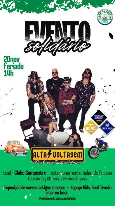 Em ação solidária às vítimas do tornado em Rio Bonito do Iguaçu, o Clube Campestre de Paranavaí promove nesta quinta-feira (20), um evento especial com doação de 1 kg de alimento não perecível. A tarde musical contará com a apresentação da banda Alta Voltagem, reconhecida como a melhor AC/DC Cover do Brasil, além das aberturas com Dona Zilá e Deep N’Strong, a partir das 14h.