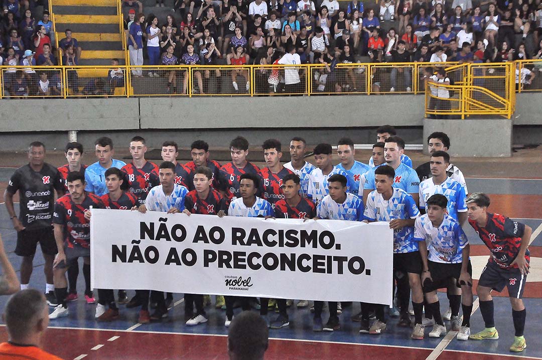 Manifestação – Os estudantes não ficaram alheios à discussão. Na tarde de ontem, antes da partida que definiria o time campeão do futsal, os atletas se reuniram no centro da quadra e levantaram uma faixa contra o racismo e o preconceito. Outras com conteúdo similar foram afixadas em diferentes pontos do Ginásio de Esportes Noroestão.