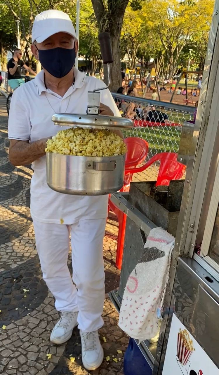 Gosta do que faz? “Eu amo o que faço e faço com muito carinho. Aí dá tudo certo, né?”, afirmou. Quem já teve o privilégio de comprar um pacote de pipoca com ele, sabe da simpatia escondida atrás da máscara que ele usa por questões de higiene.
