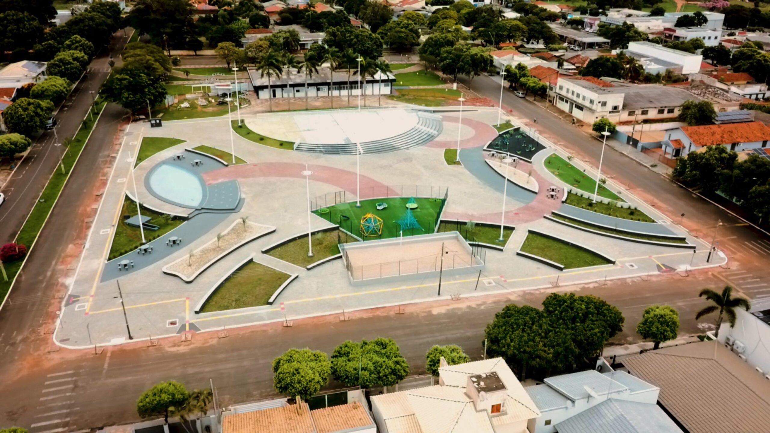 Estrutura completa e moderna – Pensada para atender diferentes públicos, a nova praça se tornou um ponto de encontro para as famílias. O espaço conta com parque infantil, quadra de areia, academia da terceira idade, área de convivência com bancos e paisagismo, além de um amplo espaço central projetado para sediar eventos comunitários e culturais.