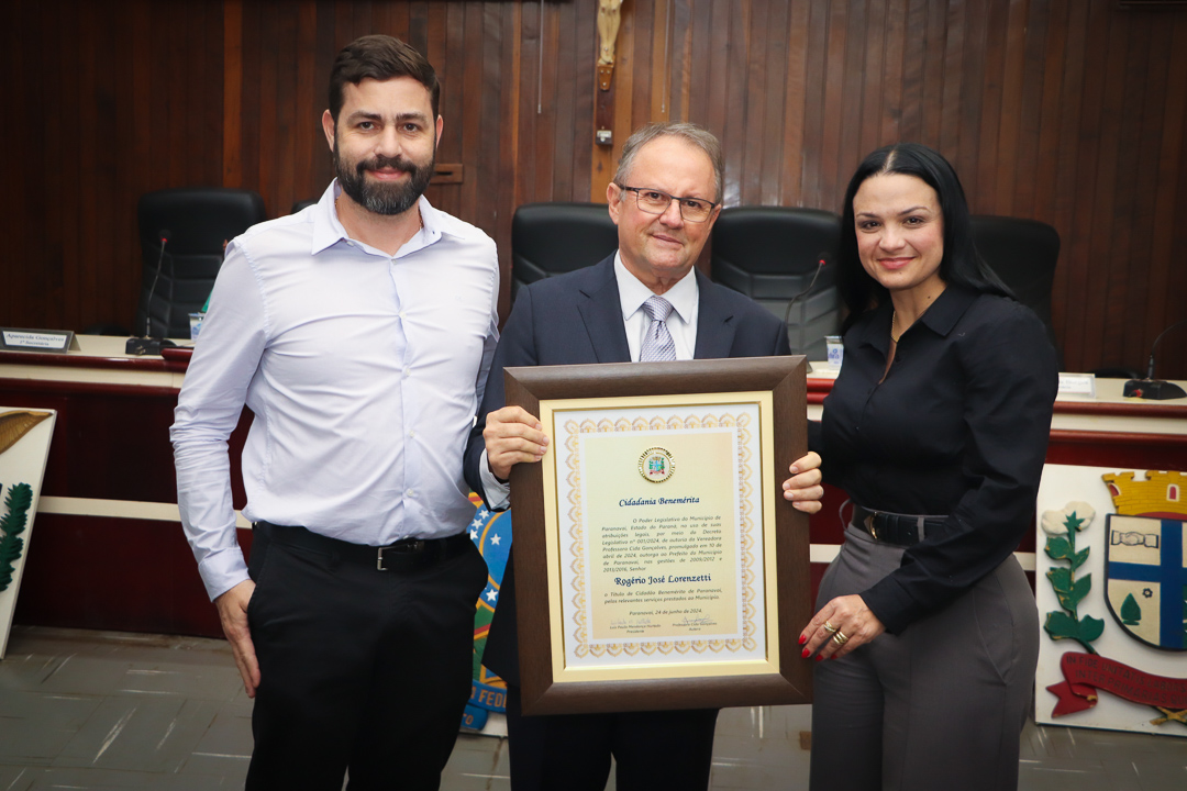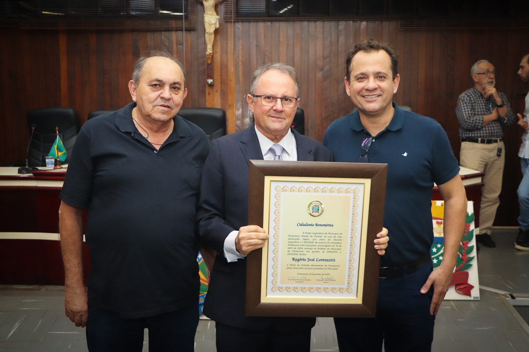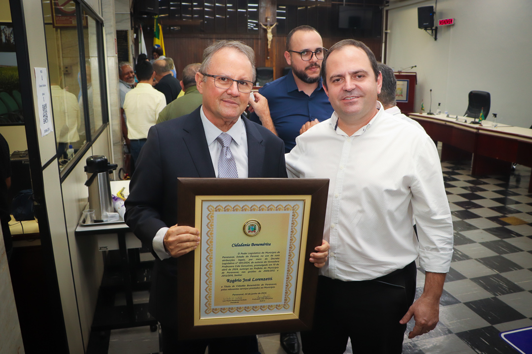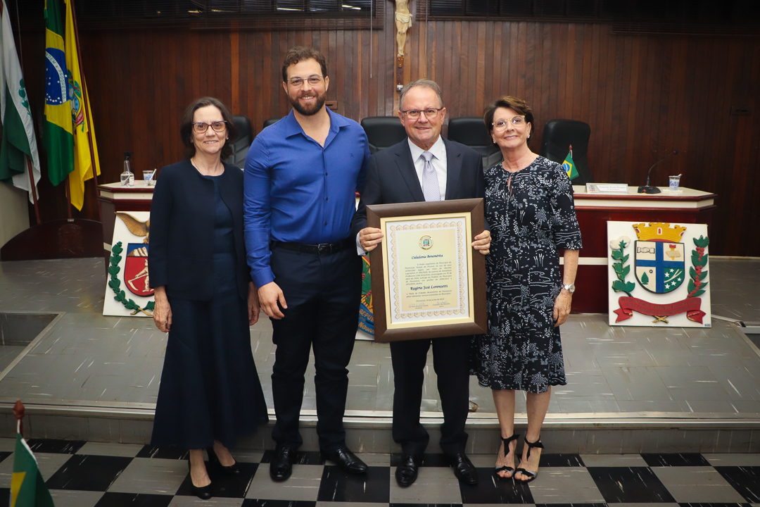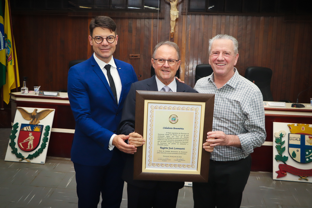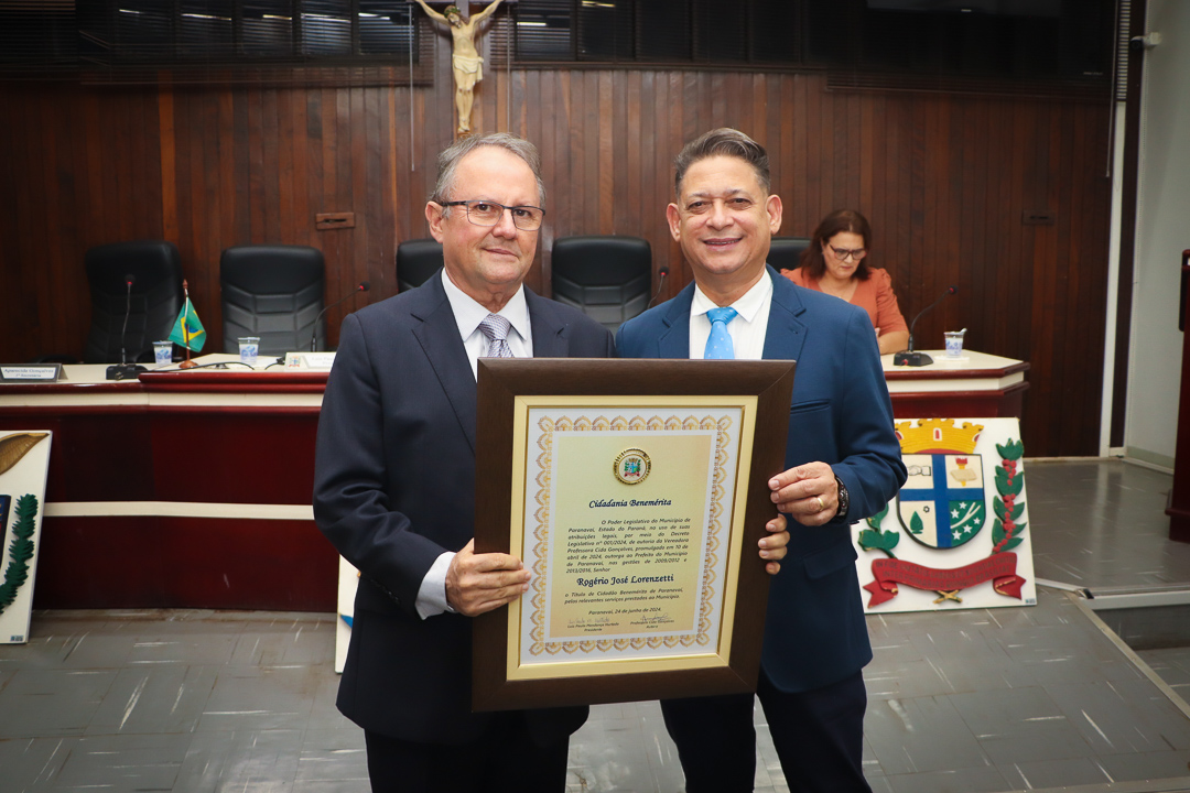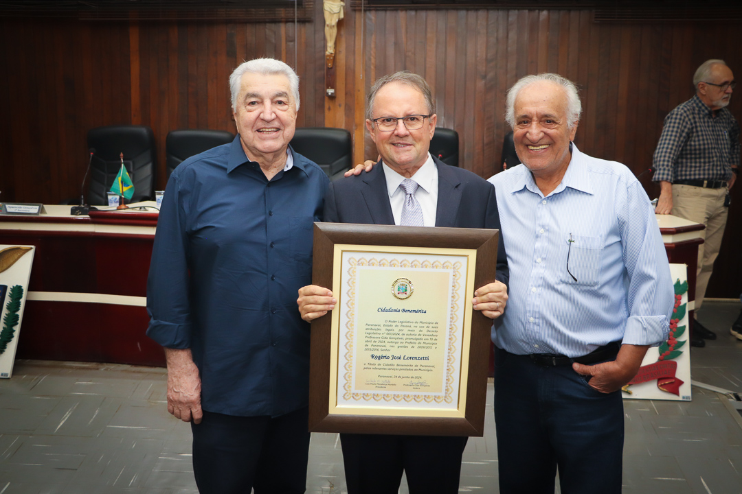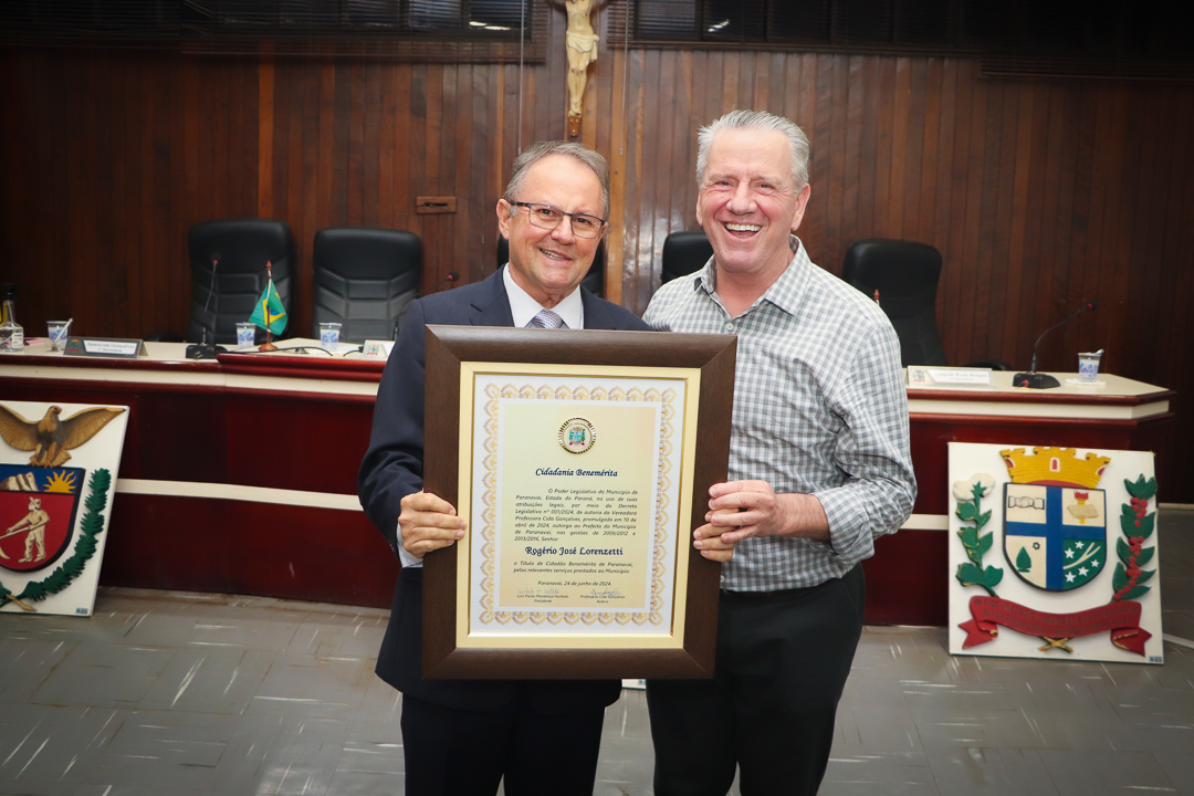 Em uma cerimônia marcada pela emoção e reconhecimento, a Câmara Municipal de Paranavaí concedeu o título de Cidadão Benemérito ao ex-prefeito Rogério José Lorenzetti. O evento, realizado no plenário da Casa de Leis, reuniu amigos, familiares, colegas de trajetória política e diversas autoridades locais e regionais.