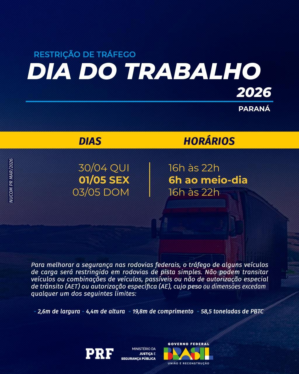 Durante a operação da PRF, também haverá restrição de tráfego para veículos de carga com dimensões excedentes em rodovias federais de pista simples. A medida começa nesta quinta-feira (30), das 16h às 22h; na sexta-feira (1º), das 6h ao meio-dia; e no domingo (3), das 16h às 22h. A restrição se aplica a veículos ou combinações que ultrapassem limites de 2,6 m de largura; 4,4 m de altura; 19,8 m de comprimento e 58,5 toneladas de PBTC. O descumprimento pode gerar multa e retenção do veículo.