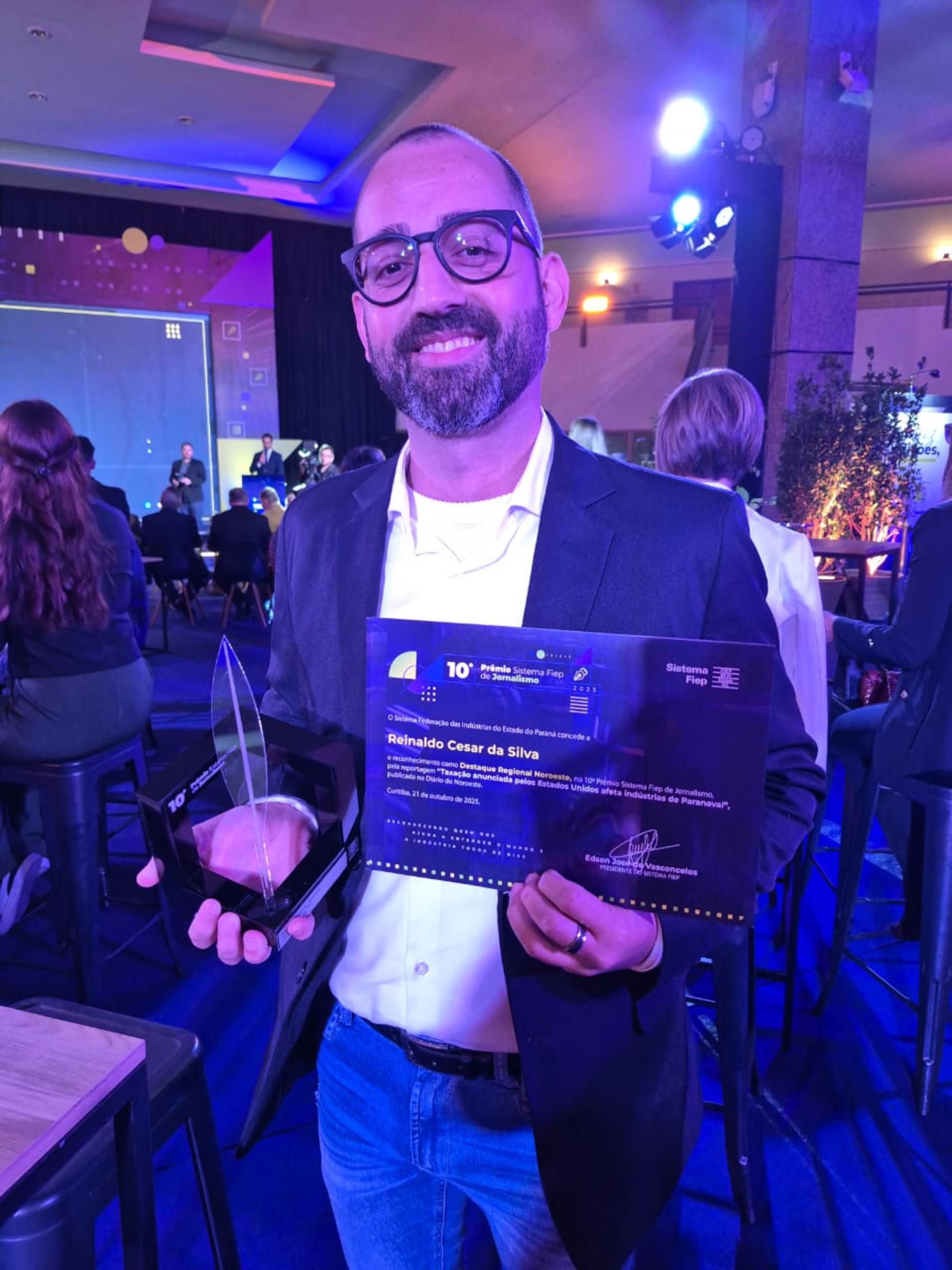 O jornalista do Diário do Noroeste Reinaldo Silva recebeu o prêmio Destaque Regional Noroeste no 10° Prêmio Sistema Fiep de Jornalismo. A entrega foi na noite de terça-feira (21) em Curitiba, no Campus da Indústria.