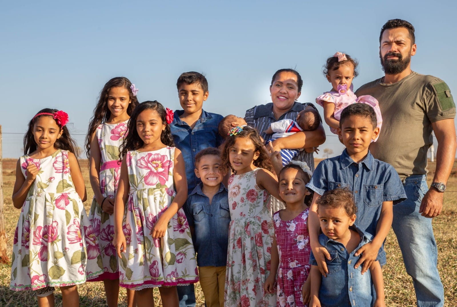 Gisele se casou aos 26 com Antônio dos Santos, antes de ele completar 30 anos. Ela é de uma família de 5 irmãos e, ele, de 9. Aos 27 anos ela ficou grávida do primeiro filho, Davi, que hoje tem 13 anos. Depois vieram os próximos, como uma cascata. Maria Isabel tem 11 anos, Ana Rita com 10, Ester de 9 anos, Miguel tem 8, Mariana demorou um pouco mais para nascer, tem 6, o Bento tem 5, Carmen com 3 anos, Francisco com 2, Ana Catarina tem 1 aninho e os gêmeos, mais novinhos, Joaquim e Benjamim com 10 meses de vida.