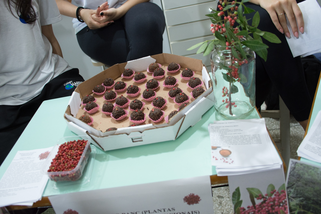 Na bancada, brigadeiro com pimenta-rosa e bolo e salgado com espinafre africano, prontos para a degustação. Delícias para o paladar e porções de conhecimento sobre as propriedades de cada planta.