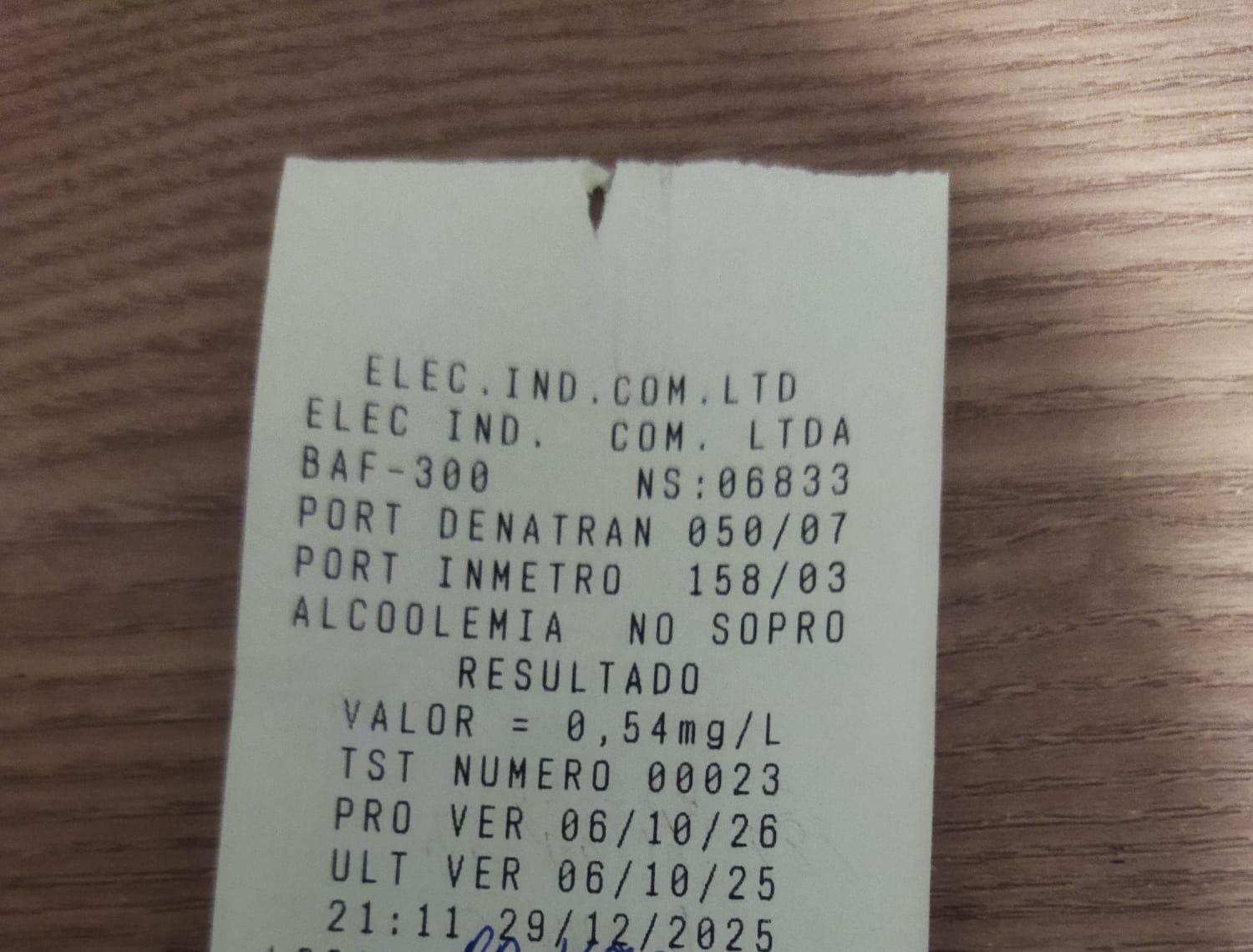 Diante da situação, os policiais utilizaram sinais luminosos e sonoros para dar voz de parada ao veículo. Durante a abordagem, foi constatado que o condutor apresentava sinais visíveis de embriaguez. O motorista foi submetido ao teste do bafômetro, que apontou 0,54 miligramas de álcool por litro de ar alveolar.