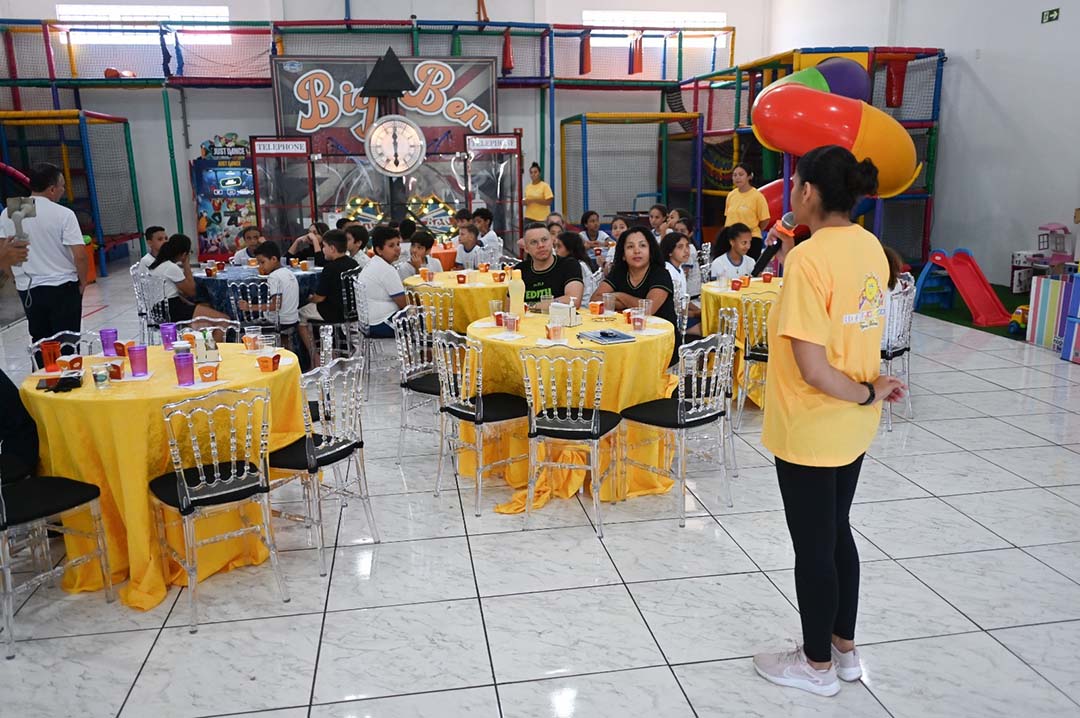 Manhã de terça-feira, 12 de dezembro de 2023, nove e pouco da manhã. O Papai Noel já está por aí com o seu saco de presentes e aquele jeitão de vô que todo mundo gosta. Nós, do DN, fomos ao Buffet Tayna Mateus por um motivo nobre: receber estudantes do 5º ano, marcando o encerramento do Projeto Semeando Leitores, ação do Diário do Noroeste em parceria com a Secretaria Municipal de Educação.