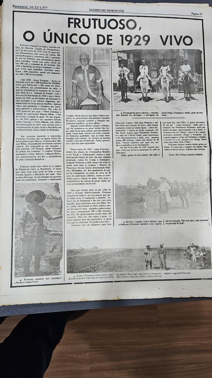 Frutuoso também foi matéria de página inteira, já que em 1977 era o único ainda vivo daqueles que chegaram à cidade em 1929. O texto, muito relevante inclusive do ponto de vista historiográfico, foi assinado pelo jornalista Saul Bogoni e Neuza Loureiro Schlela.