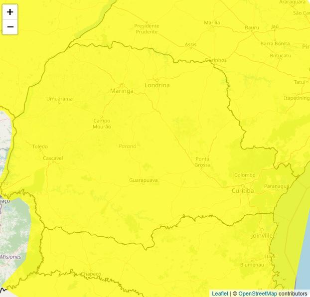 Há risco de tempestades, com chuvas volumosas de até 50 mm/dia, ventos intensos que podem chegar a 60 km/h, e queda de granizo. Segundo o Inmet, o risco de corte de energia elétrica, estragos em plantações, queda de galhos de árvores e de alagamentos é baixo.