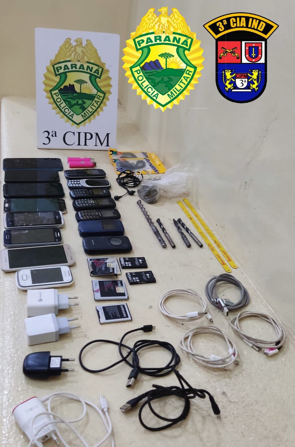 Nas proximidades, os policiais acharam um invólucro com substância análoga à maconha, que a adolescente assumiu ser dela e, próximo a eles, também tinha uma sacola com diversos aparelhos celulares, carregadores, brocas e serras.