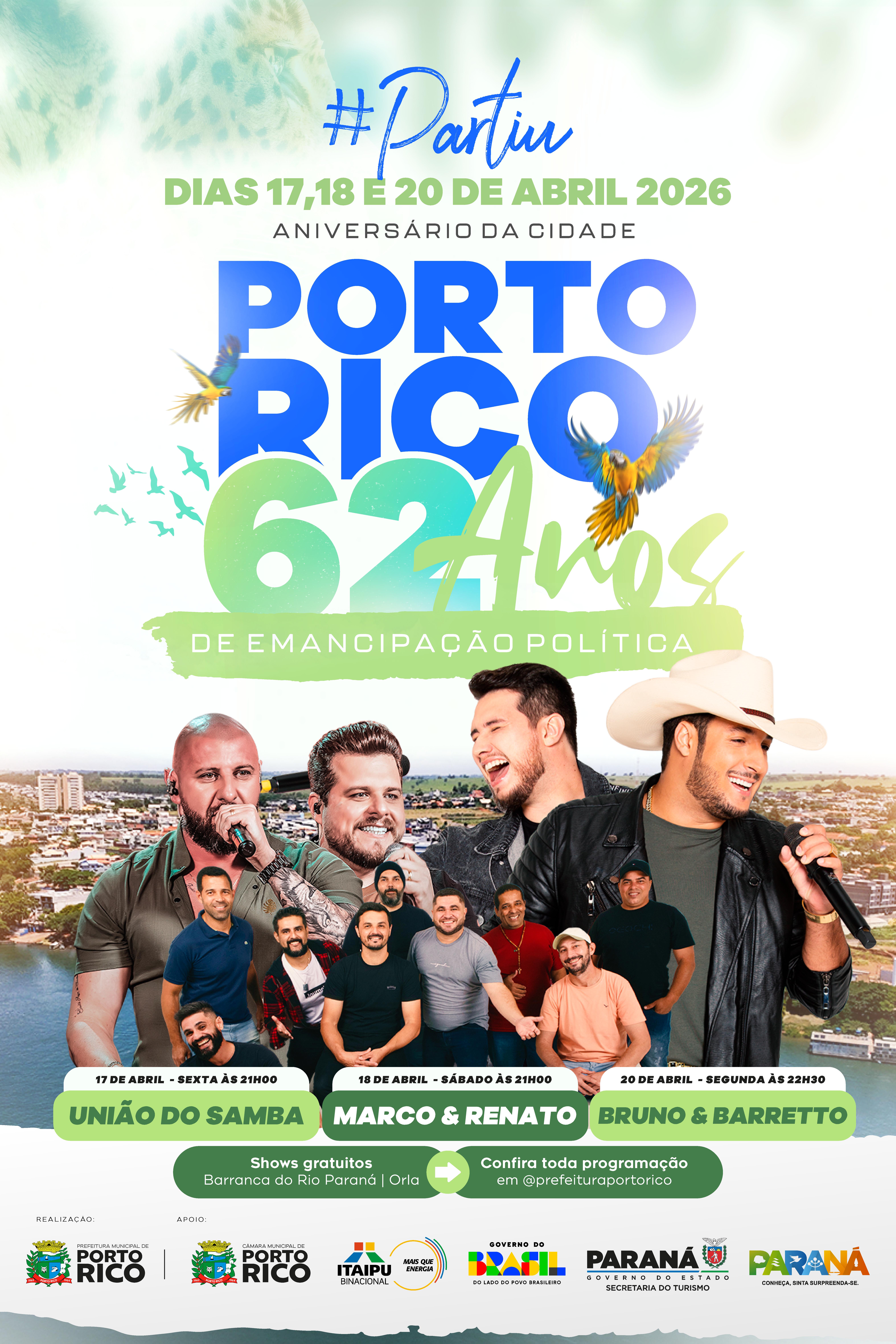Para o prefeito, o momento é também de acolhimento e valorização do potencial turístico do município. “Serão dias de shows e muita diversão. Todos são muito bem-vindos, moradores, visitantes e turistas. Venham com toda a família celebrar conosco os 62 anos de Porto Rico”, convidou.