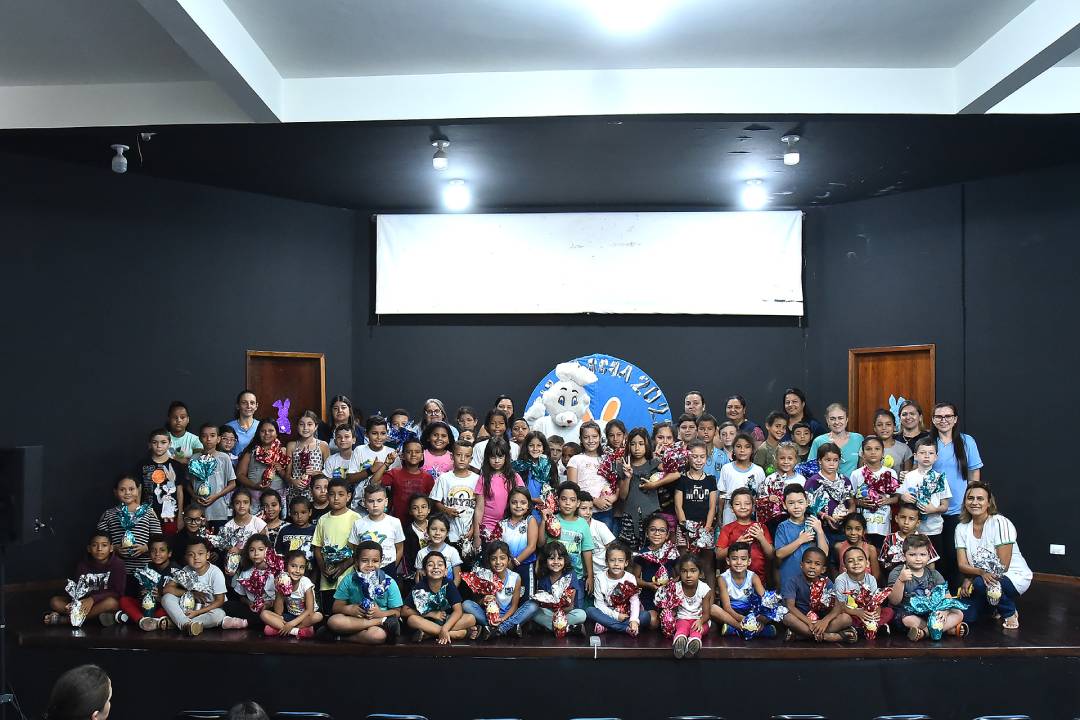 Na manhã de ontem, 307 crianças da rede municipal de ensino de Santo Antônio do Caiuá receberam ovos de chocolate de presente. A entrega aconteceu na Casa da Cultura e foi acompanhada de perto pelo Coelho da Páscoa, que dançou e animou a festa.
