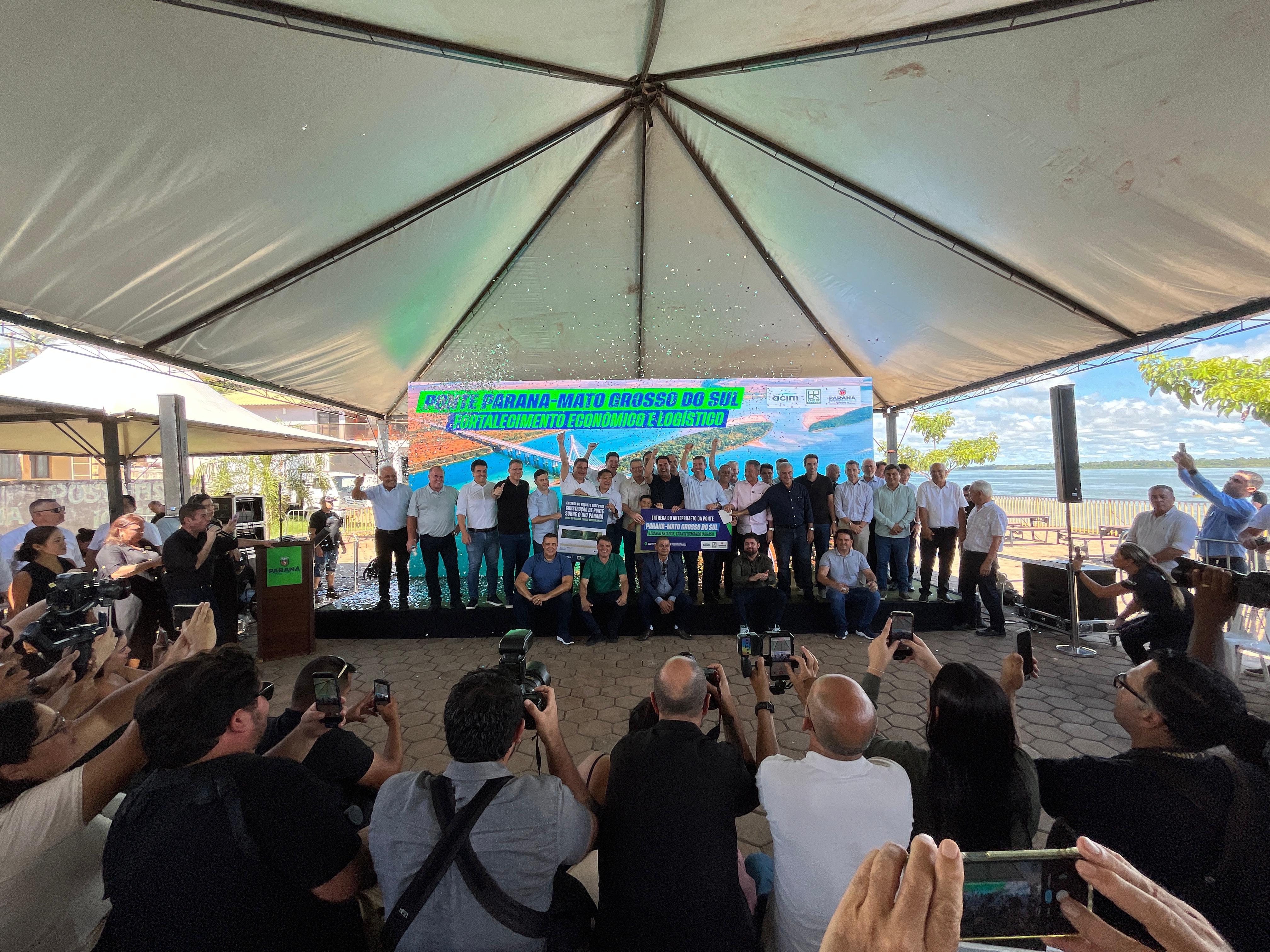 Os governadores Ratinho Junior e Eduardo Riedel receberam oficialmente, neste sábado (21), o anteprojeto da nova ponte que vai ligar os estados do Paraná e Mato Grosso do Sul. A ligação está prevista entre São Pedro do Paraná e Taquarussu e é considerada estratégica para o desenvolvimento regional.