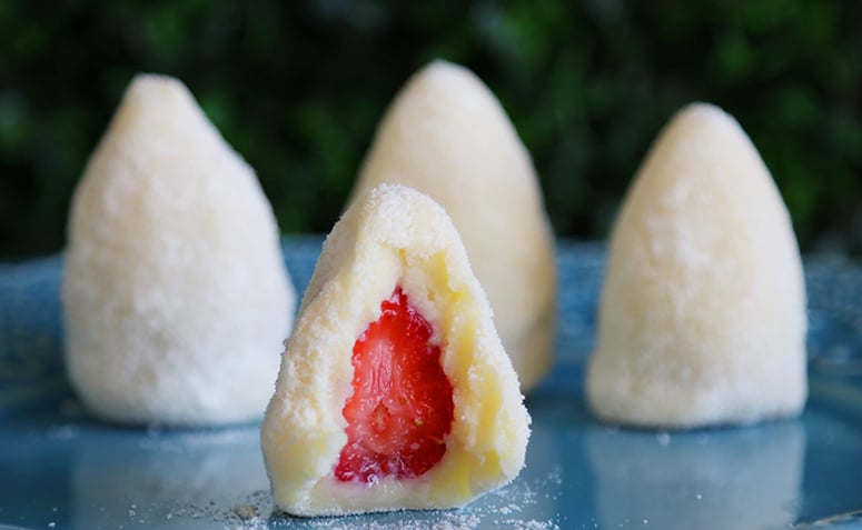 Coxinha doce de brigadeiro de leite em pó com recheio de morango