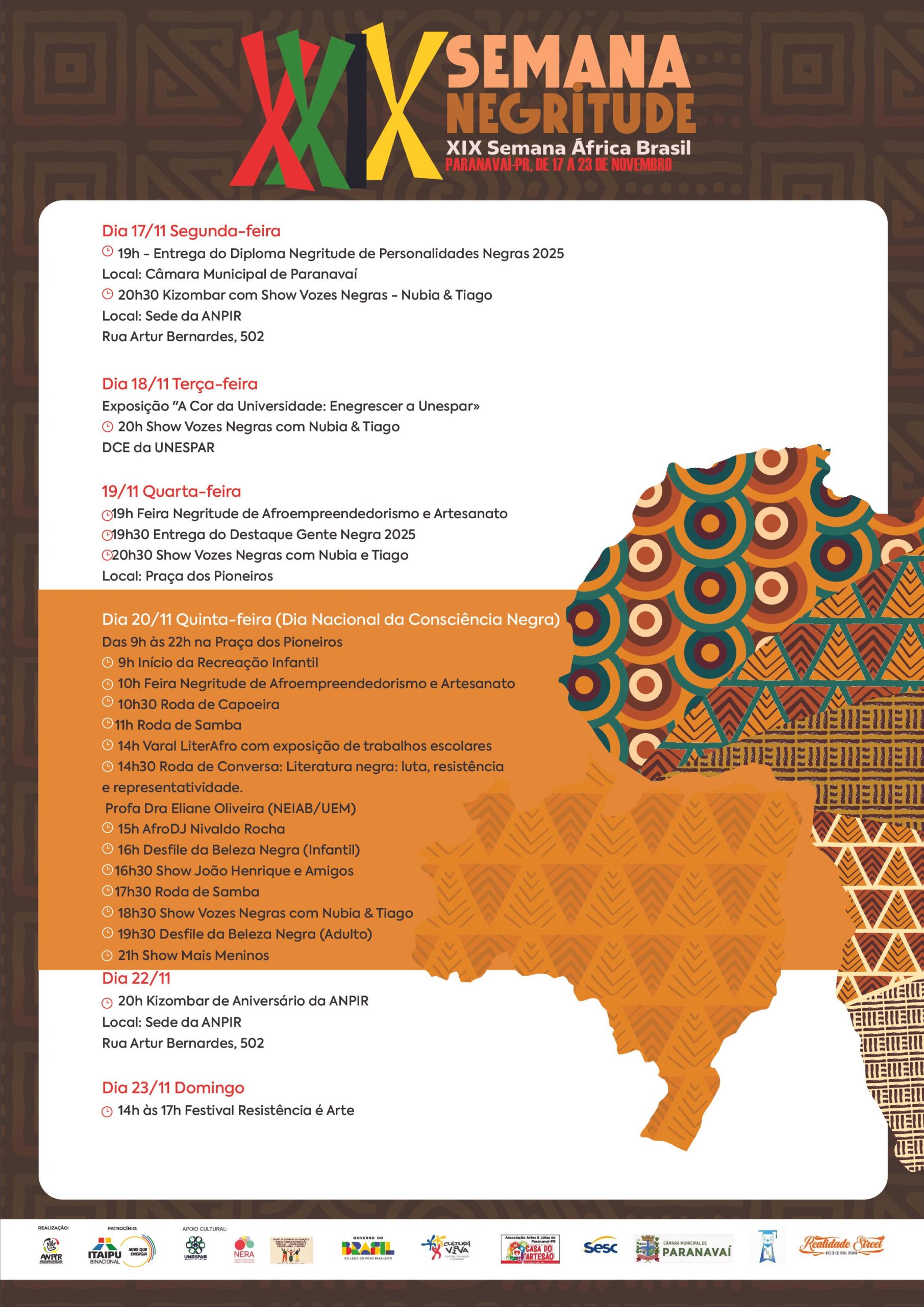 A 29ª Semana Negritude é realizada em parceria com o Sesc Paranavaí, a Fundação Cultural, a Câmara Municipal de Paranavaí, a Unespar, a  APP-Sindicato Paranavaí e tem o apoio da Itaipu Binacional.