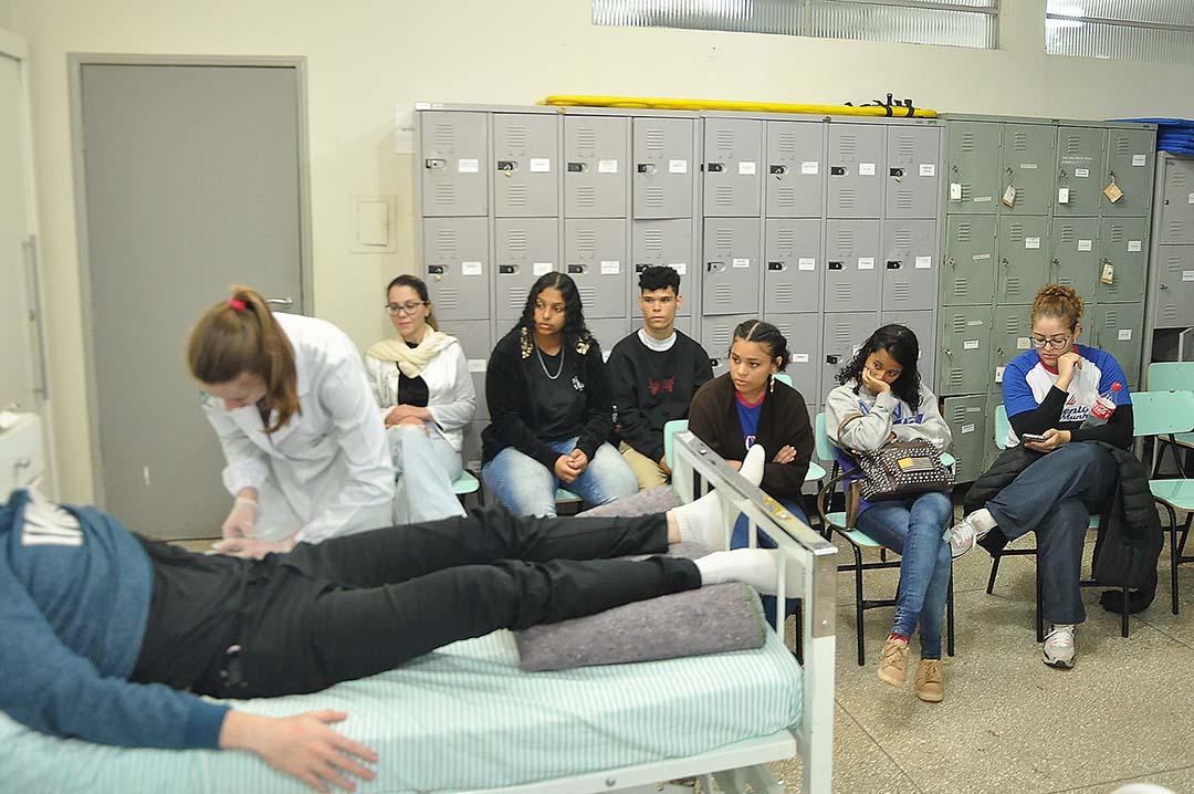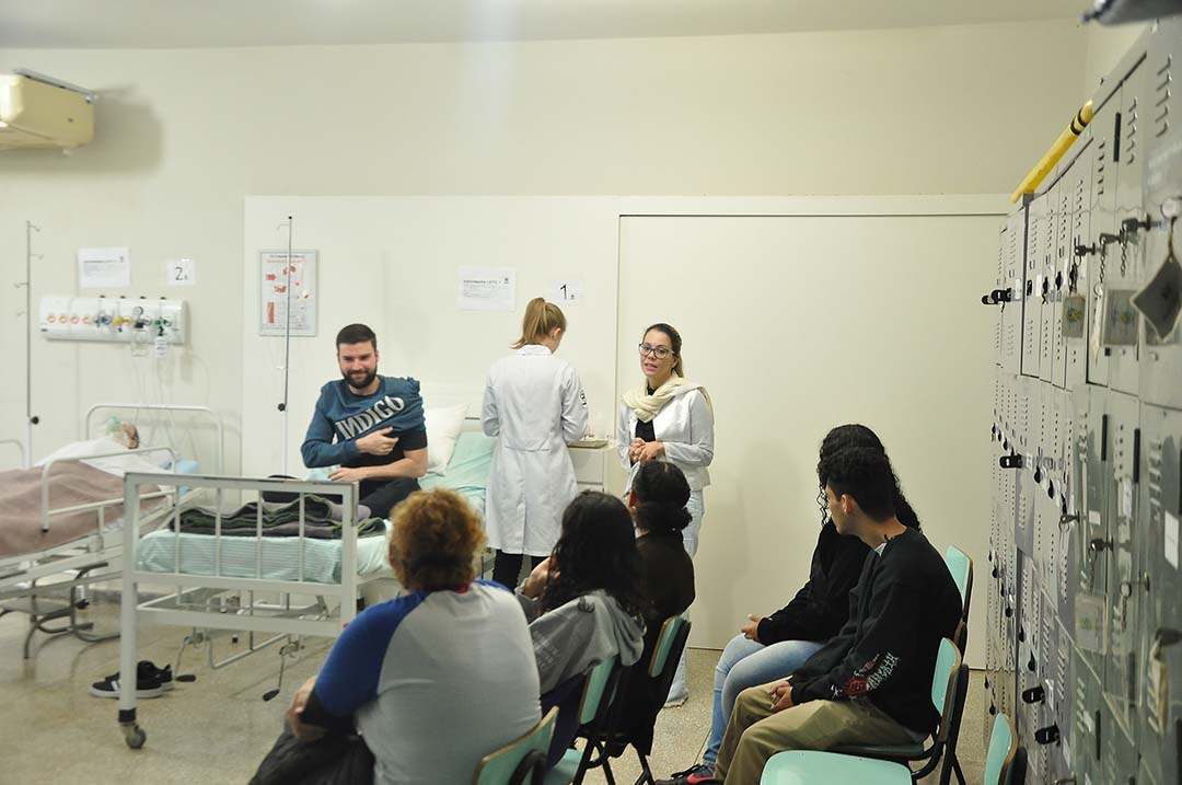 Os olhos estão vidrados na simulação feita no Laboratório de Enfermagem. A cena mostra uma enfermeira atendendo dois pacientes, um se recusa a aceitar a medicação, o outro recebe o tratamento necessário. A profissional põe em prática os protocolos para as duas situações e dá os encaminhamentos necessários.