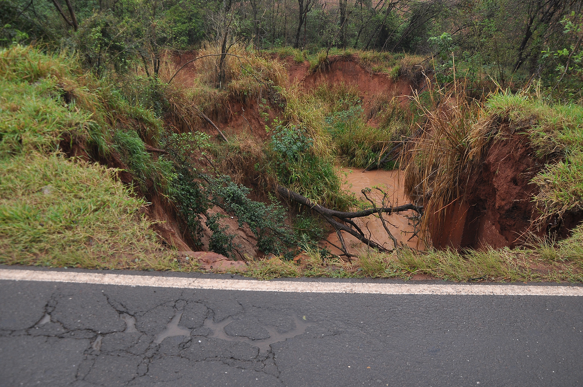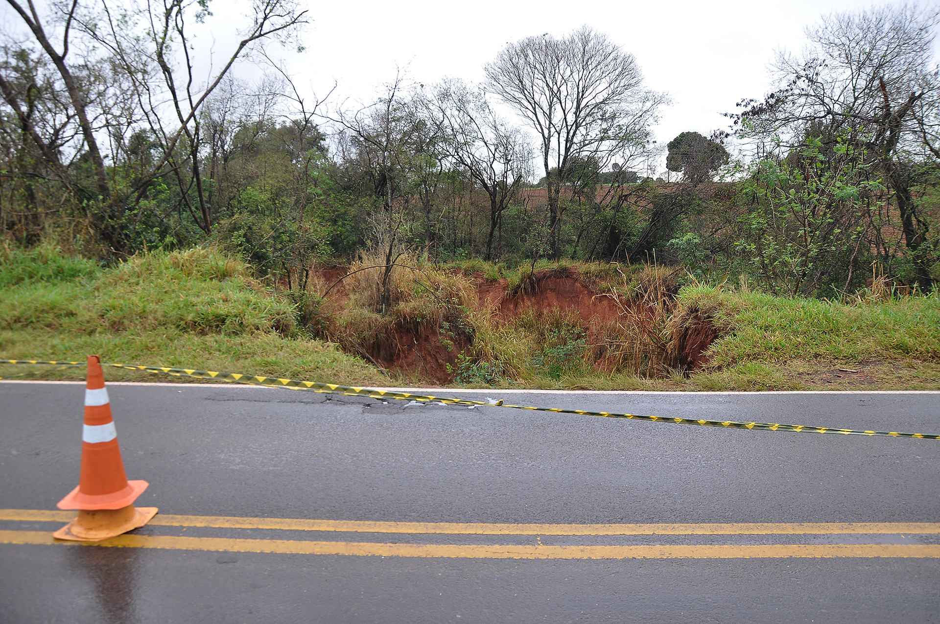 A passagem de veículos pela PR-492, entre Paranavaí e Tamboara, está comprometida. Com o intenso volume de chuva que caiu sobre a região quarta e quinta-feira, uma grande erosão avançou até a margem da rodovia, causando risco de desabamento. A pista precisou ser interditada próximo ao km 12, e o trânsito, desviado para dentro do perímetro urbano. Gerente do escritório regional do Departamento de Estradas de Rodagem do Paraná (DER-PR), Fábio de Souza afirmou que o projeto para a recomposição da estrutura rodoviária existe há mais de um ano, mas ainda não saiu do papel por causa dos trâmites burocráticos para a contratação de uma empresa executora.
