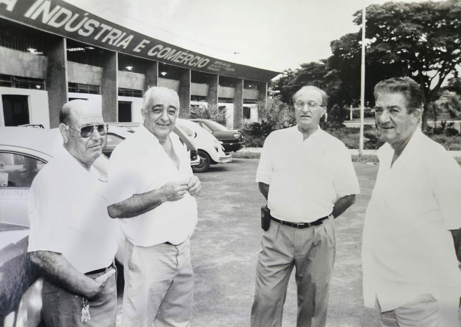 A imagem feita na frente do Pavilhão da Indústria e Comércio mostra os diretores da Rural: Mário Fernandes, Acácio Gomes Abreu, José Balestieri e Angelino Spoladori. Abreu, Balestieri e Spoladori já faleceram.
